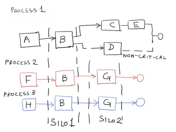Once we learn to appreciate the value of (healthy) silos, we will understand that this inertia to everything smaller than business model change is actually a good thing. The only good reason to force change externally onto a silo is a looming disruption threat to the entire business model. Why is this the case? The answer lies in the criticality of a silo. The value of a mission-critical component of a mission critical process is the value of the entire business. This may seem counterintuitive, since we are taught in operations research and management that processes are mechanisms of "progressive value addition." This is true from a normal functioning viewpoint. But when considering changes to a critical process component, we must estimate its shutdown cost due to failed change efforts.