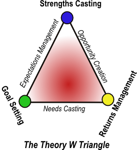 The Theory W triangle captures 3 coupled uncertainties that relate rather like position and momentum do in the Heisenberg uncertainty principle. These three basic uncertainties constraining talent management are:- What uncertainty: You may know nearly exactly what you will attempt to do, to deliver business value (goal-setting), or you may only have a broad set of ideas/directions (opportunity creation).