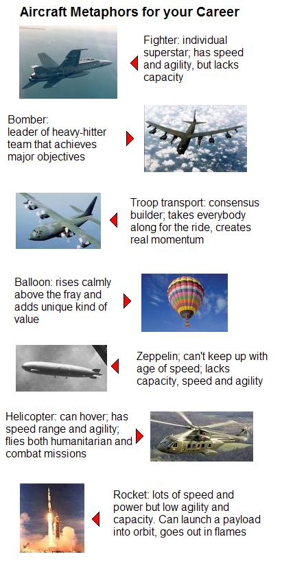I started thinking about aircraft as metaphors when I encountered a four-aircraft personality classification scheme in Vince Poscente's The Age of Speed. Poscente's model has fighters, balloons, zeppelins and rockets. The chart above roughly follows his description of the four personality types, though I changed the (negative) description of 'rocket' to a positive one, since rockets can do one thing nobody else can: launch satellites. Venture capitalists, perhaps, are rockets.