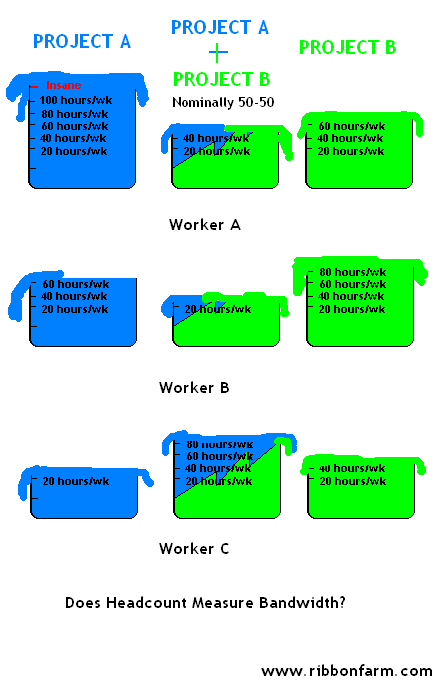 The key to the diagram above is the actual overflow point under given project loading conditions for different individuals. From the picture above, "100%" (or 1 HC) clearly means radically different things in the 9 cases. Let's remind ourselves why HC and traditional "project" definitions are mostly meaningless for the purposes of real (rather than ceremonial and budgetary) resource management and capacity optimization.