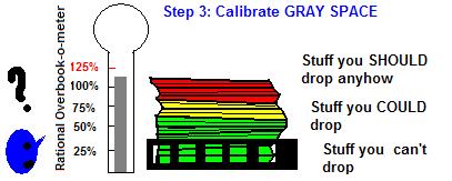 HOW: Look through every item in the momentum sheet, and give it a ranking according to the scale in your perspective calibration scale. Next, guesstimate the level you think you might be shooting for in your resolutions list, say 8. Make a note on the margin of the momentum sheet saying: "2009 target level: 8." For anything on Momentum that you marked less than an 8, try to note down next to it what it would take to get rid of the activity. Delegation, cold-turkey-stopping, hiring, firing, setting a building on fire. Whatever. Now you have stuff to bump to make room for stuff you want to do. You don't need to figure out how to drop the activity instantly on Jan 1. You just need to know that it is dispensable, if you could find a way. If you are trying to create a month of room to start a new novel in 2009, you're probably good to go if you are able to maneuver a significant delegation by October 2009. So you have time.