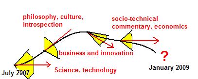 I wrote 80 articles in 2008, and this post contains an annotated list of links to all of them. Ribbonfarm.com still doesn't know what it wants to be when it grows up. Here is a picture of how my focus has shifted, drifted and meandered since I started in July 2007 (here's the 2007 omnibus review). Red arrows point to the blog's 'soul' at various points. Yellow 'scope' wedges show the changing ADD levels.