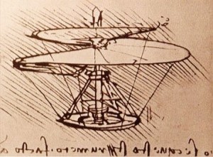 But perhaps it would be good to finish this retrospective with Da Vinci. I have heard no more heartwarming bridge-the-gap tale than this: Da Vinci's brainchild, the helicopter, was finally made real by Igor Sikorsky, who was funded by the composer Sergei Rachmaninoff, who supported Sikorsky's research with a $5000 check. So much for facile ideas that "art" is some kind of precious flower that must at once be protected from, and funded by, the rapacious endeavor of engineering. That killing machine of Vietnam and life-saving machine of emergency rescues might not exist if a rich artist had not decided to support a starving engineer. Perhaps that is why the enduring symbol of the Ancient Eye is neither the test-tube, nor the paintbrush, but the notebook. Here is Da Vinci's notebook helicopter sketch from the 15th century (Public Domain),