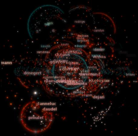 Perhaps it is this. To me, the most soul-stirring direction in which to turn the Ancient Eye is towards the unknown, towards what we don't know, towards doubt. Stuff that we can't even explain to ourselves, let alone teach others or "spread." Here are two such images, whose significance I don't yet fully understand, that have had me pondering a lot lately. One is a screenshot from Michael Ogawa's Code Swarm visualization of the evolution of the Eclipse software project.