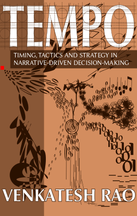 The longest series on this blog, the Gervais Principle series, currently weighs in at about 24,000 words, and will close at about 28,000 when I finish the last part. Since the narrative there is not as tightly integrated, it has not been as hard to scale. So though I do eventually plan to publish that in "book form," I really won't dignify it with the noun book. When I get done with that, it will be a blook, and though there are people out there ready to tell you that any half-coherent collection of 10-12 blog posts is a legitimate book, I now know that's just too low a standard. It isn't the publishing vs. self-publishing distinction or the book vs. ebook distinction that matters. A serious book project is intrinsically a far harder intellectual challenge than a blog series. At least if you've challenged yourself and are attempting to write something worthwhile and ambitious. Tempo will have its share of flaws, but lack of ambition won't be among them.