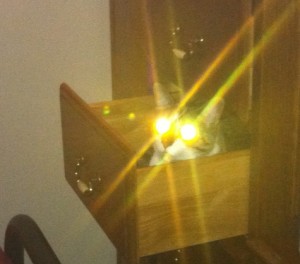Following the pub meetup (which included a game of darts where I came in dead last), we moved to a party somewhere else in Ottawa and returned rather late to Alex's house, where I shared the futon for the night with his cat, Darwin, who likes to sit inside dresser drawers. I took this amazingly evil picture of Darwin that I am itching to post in an intelligent design forum. Dawkins bless camera flashes and cat corneas.
