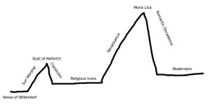 We can interpret the art discussed in Sexual Personae as a single narrative with a double Freytag Triangle, and you can see the subconscious ‘grand strategy’ within the Western artistic tradition, and understand better what makes certain archetypes beautiful (click for larger image; the two peaks are the Bust of Nefertiti and the Mona Lisa respectively, while the beginning and end are the Venus of Willendorf and Modernism respectively).