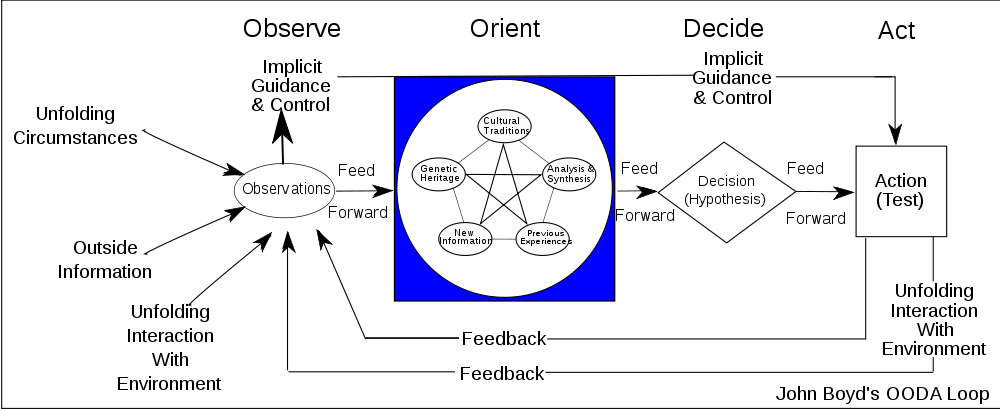 Back then, I thought I understood OODA, based on a casual first encounter and my own background as a control theorist (the field is all about feedback loops, and OODA at first sight just looks like a feedback loop diagram). With my second look however, I realized that there was a lot more to the loop. So I bookmarked it as a "Hmm! This really isn't a standard control-theoretic loop" but didn't dig much deeper.