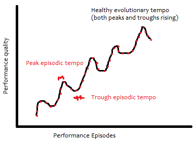 Humans naturally think about their own behaviors in terms of peak and trough performance levels, rather than means or medians. Without any performance tracking, we know our limits in a variety of domains. Each time we attempt a performance episode in any skilled domain, these limits change, yielding a learning curve. It has a characteristic tempo, depending on the episodic performance quality, as well as a tempo across episodes, that is correlated with quality. I prefer this model of a learning curve that I made up to the usual smooth, S-shaped one with a plateau at the end. I'll explain why in a bit. This picture is related to what I called the Freytag Staircase in the book, but is not quite the same.