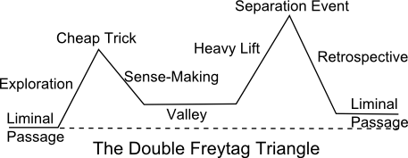 The core idea is what I call epoch-driven time management: varying your behaviors based on the tempo of a project. The idea can be generalized to your whole life, but let's start with a single project, a thread in your life. This diagram, the Double Freytag triangle, which I discussed at length in the book, is one systematic way to carve up the time-line of your project into epochs with consistent tempos.