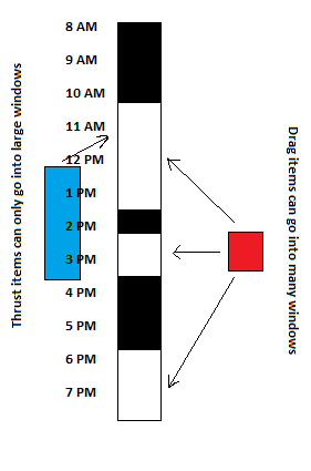 For the other half, consider the difference in content between long and short jobs in human work. It turns out that there is a very interesting correlation: longer tasks (4 hours or more) are more likely to be the productive, creative ones (like writing or coding sessions), while short tasks are more likely to be busywork. Call the former thrust tasks, and color-code them blue, and the latter drag tasks, and color-code them red.