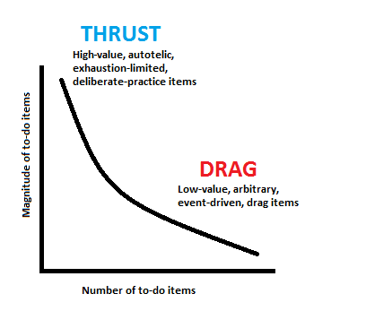 If you do creative information work, I will bet you that your current to-do list will yield a distribution that looks something like this: lots of little drag tasks, and a few big thrust tasks.