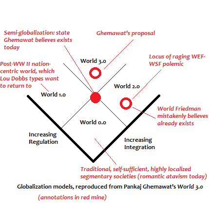In terms of progress along the Z, we are somewhere halfway between 1.0 and 2.0 according to Ghemawat. At 1.5 say. His broad argument is that 0.0 is a hopelessly deluded and unrealistic state to attempt to get back to. 1.0 is achievable, but at enormous economic cost and reversal of global standard of living gains. Friedman's "flat world" 2.0 is far too dangerously chaotic, but if international institutions of the right kind (i.e., not the World Bank/IMF type mechanisms) aren't created or strengthened appropriately, we may well end up in a disaster-prone 2.0 regime, or fall back to a primitive 1.0 state.