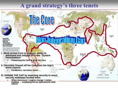 Thomas Barnett's interesting map of the world postulates one such boundary between the zones. The "Core" might be Zone 1 and the "Non Integrating Gap" might be Zone 2 (image from New World Notes).