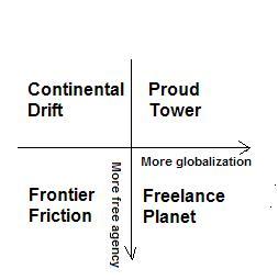But glossing over those difficulties (making good 2x2 diagrams is an art form), at a very rough level, you could say that Continental Drift maps to 1.0, Proud Tower to World 2.0 and Frontier Friction to World 0.0. Freelance Planet doesn't really map to Ghemawat's model, and his World 3.0 does not really map to this 2x2.