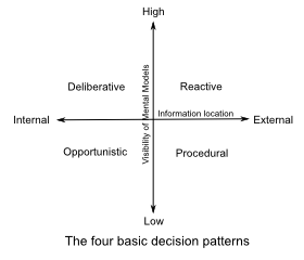I suggested that there are four basic kinds of tactical pattern: reactive, deliberative, procedural and opportunistic, that could be conceptualized via this 2x2, where the x-axis represents the locus of the information driving the action (inside/outside your head) and the y-axis represents whether the information has high or low visibility (i.e. whether it is explicit and in awareness, or whether it is part of the frame/background, and below awareness).