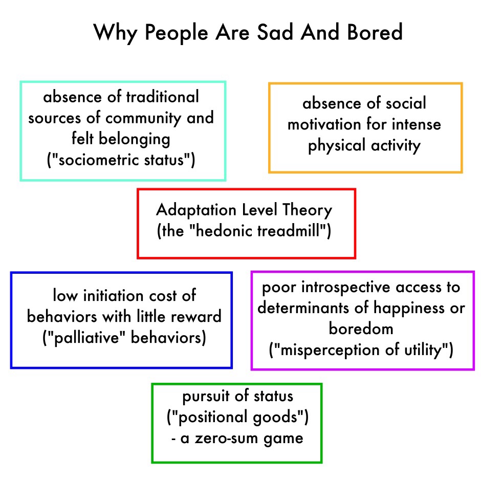 The lower levels of Maslow's pyramid reflect material well-being. But material abundance is not itself the cause of anomie and angst. Rather, ancestral, evolved solutions to lower-level problems also tended to contain solutions to higher-level problems as well. As these ancestral solutions are made obsolete by solutions that are more efficient on the material level, the more ineffable, higher-level problems they solved present themselves anew. Simple abundance of food is not the cause of obesity, but rather the loss of carefully evolved ancestral diets. Our ancestors found it easy to get to sleep because they were tired from intense physical activity; we often find it a challenge to get to sleep because modern solutions to material problems do not include physical activity. We are lonely and bored not because of material abundance simpliciter, but because the specific cultural patterns that have reproduced themselves to produce material abundance have whittled away the social and psychological solutions that were built into old solutions to material problems.