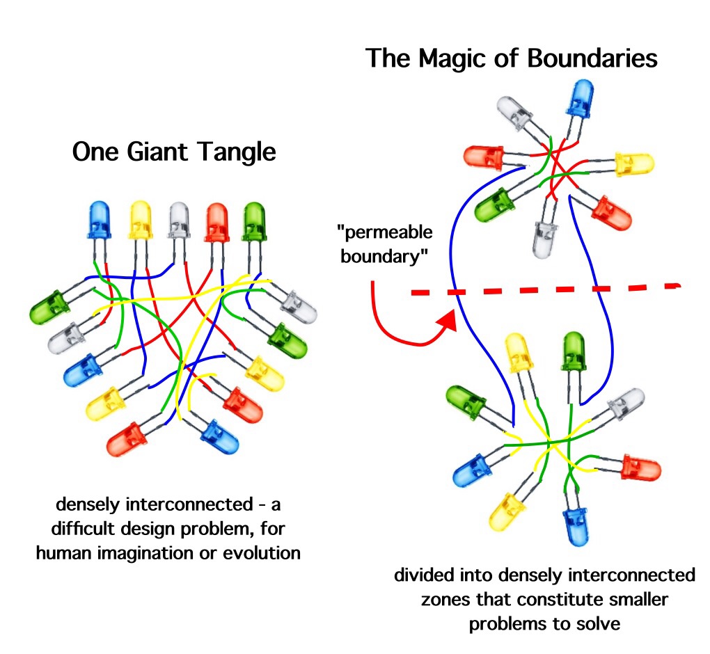 The existence of these zones of dense interconnectedness, that are not densely interconnected to each other, is a prerequisite for solvability. They are surrounded by a kind of permeable boundary, as pictured. This is analogous to "information hiding" in object-oriented programming; just as a living cell controls what enters it and acts on it, an electronic "object" limits access to its internal processes, accepting and returning only certain types of information. More ominously, a "black box" with limited interaction that solves a problem effectively is often so useful that it backfires: it becomes a new, required "solution" that limits the space of future design, often ironically resulting in poor fit. (More on this in the later section entitled "Tiling Structures and Monstrosities.")