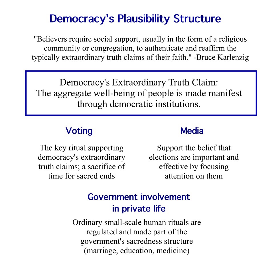 We may ask a very practical question: where lies the agency that accepts or rejects certain "black box" structures or tiling systems? An important myth of our time is that voting is an effective way for individuals to have agency in a democracy. The idea that the aggregate will of millions of people is adequately expressed by voting in elections is a rather outlandish claim, and clearly one with much evidence against it, but the "plausibility structure" of democracy causes us to believe this fiction on faith.
