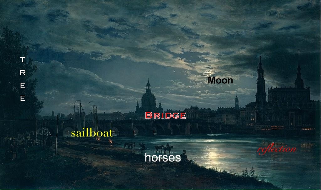 Noise pollution is rampant and very damaging, but a more subtle form of pollution, equally unremedied, is legible word pollution. Here is Johan Christian Dahl's 1839 painting View of Dresden by Moonlight: