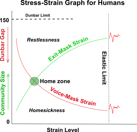 The voice-mask strain graph is upside down because the bigger the community, the easier it is to lower your voice mask and speak your mind. You can think of the Dunbar Gap (150 minus the community size) as the measure of the stress. We are under the lowest possible voice-mask stress when the Dunbar Gap is zero, and under maximal voice-mask stress when we are alone (again, in the sense of belonging rather than merely being around people).