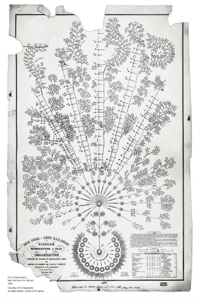 About a year ago, an 1855 org chart of the New York and Erie railroad was cascaded worldwide by the VP of the Infographics Department of the Internet. There was a good deal of admiration as well as lamentation. Apparently we no longer care enough about our corporations to create beautiful depictions of their anatomy, ars gratia artis. Whatever else the shortcomings of mid-nineteenth century corporate management (they had a tendency to start wars and gun down workers in pursuit of their Missions and Visions among other things, and you had to be a quick-draw gunfighter to earn a Harvard MBA in those days), they clearly cared.