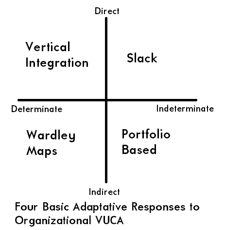 If you do have control (or can acquire control), you can operate in direct-determinate (Q2) ways: lower VUCA by simply buying up and integrating everything you need, soup to nuts, making the competition less relevant, and using more traditional management methods (the analogy in control is adding more actuators to control previously uncontrolled behaviors, lowering the need for adaptation).