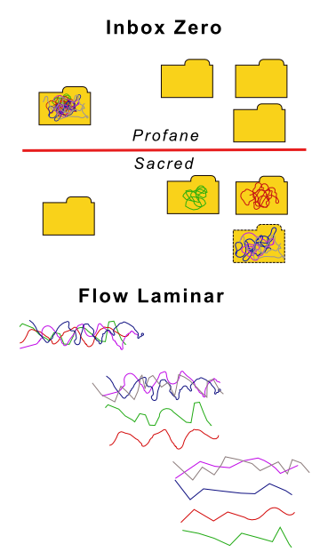 The world of stream-metaphor workflows in tools like Slack and Github -- with strongly emphasized temporal structure, and the realistic probabilistic expectations of chat replacing the illusory deterministic expectations of email -- has made me reconsider how I think about information processing. In particular, I've moved from an Inbox Zero mental model to a Flow Laminar mental model, as illustrated in this picture.