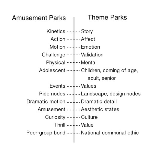 If Disneyland is the canonical theme park, then Six Flags is the canonical amusement park: focused on kinetic rides, lacking narrative detail and structure, providing distraction and amusement rather than values-laden, focused entertainment. To distinguish amusement parks from theme parks is not to judge amusement parks as bad or wanting; they are simply a different and distinct phenomenon from theme parks. Margaret King offers these criteria to contrast the two: