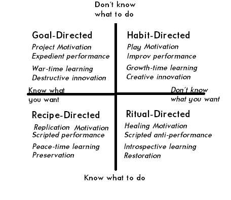 Moral of the story: always complete a triad into a 2x2. You don't know what obvious-in-hindsight idea you might be missing. By performance in the diagram, I mean an activity that is expected to result in the generation of value in the external world, through some sort of means-ends reasoning. By this definition, ritual that is informed by sincere and literal belief in religious ideas is not actually ritualistic. It belongs in one of the other three quadrants (usually recipe-directed), even though it is based on unproven or false causation models.