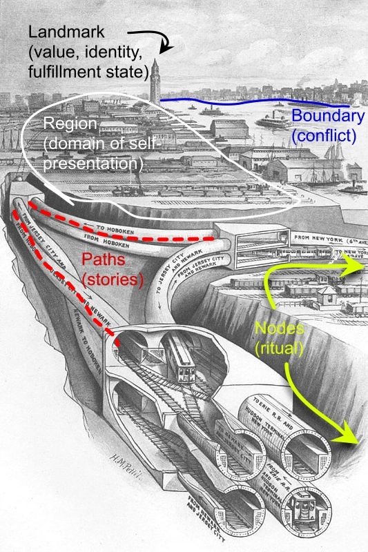 In my previous post, I described Kevin Lynch's five-part structure of how people form mental maps and navigate the geographic space of cities. Lynch's research suggested that people form mental maps with five basic features in order to navigate: boundaries (such as water lines, freeways, and walls); regions (such as neighborhoods); paths; landmarks (highly visible and reliable components of the landscape that don't change or change in a predictable manner, such as mountains, buildings, or the sun); and nodes (the places people go and enter into, such as home, work, shopping, churches, restaurants, and parks, and also the transitional areas between forms of transportation, such as train stations).