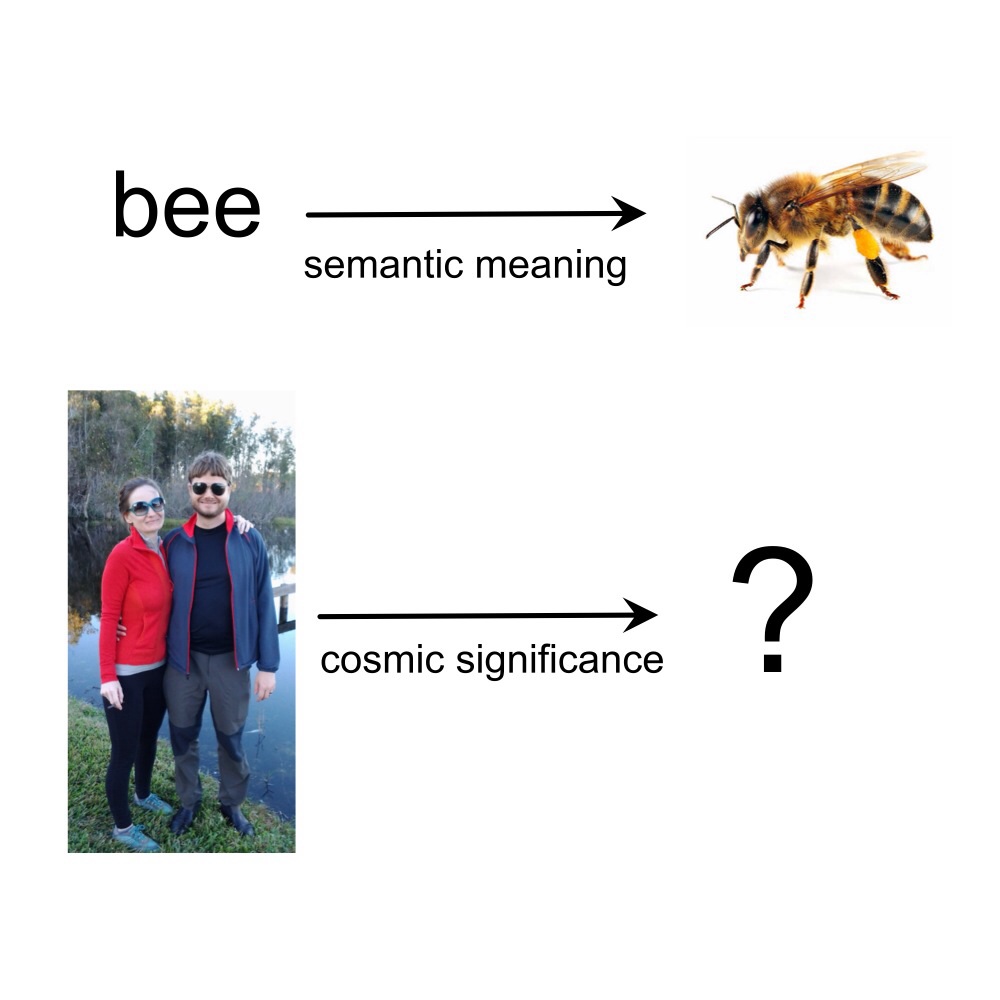 Whether by semantic contamination or natural extension of meaning, the pointing/reference sense of semantic meaning is preserved in personal or cosmic meaning. In literature, pointing by allusion is a way of elaborating meaning. Listening to The Doors' song "The End" after reading Zhang Xianzhong's Seven Kill Stele, I noticed that the word "kill" is repeated seven times at the end of each, and wondered if Jim Morrison had been alluding to the latter piece. Brief investigation suggested that it was a mere coincidence: not a pointing relationship, hence not, in this sense, meaningful. Coincidences themselves, however, may be experienced as meaningful when they seem to "point," even if their point can't be discovered: they create an illusion of missing causality, of hidden significance. What does it mean?