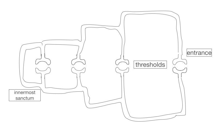 The courthouse follows a universal pattern of "sacred space" identified by Christopher Alexander in A Pattern Language: successive entrances and chambers of increasing privacy and effort to enter (see figure). The courthouse itself is accessible by a main entrance, these days often guarded by a metal detector and attendants. Then, rather than accessing the courtrooms directly, there are usually hallways, elevators, or both. Courtrooms are guarded by bailiffs, and governed by special codes of ritual conduct (no chewing gum or using phones, and special attention must be paid and quiet observed if the judge enters). Within the courtroom, an area (often demarcated by a gate) is reserved for attorneys and litigants. Finally, and most private and inaccessible, is the judge's area, the bench and "chambers," open only to the judge, his attendants, and sometimes litigants by invitation.