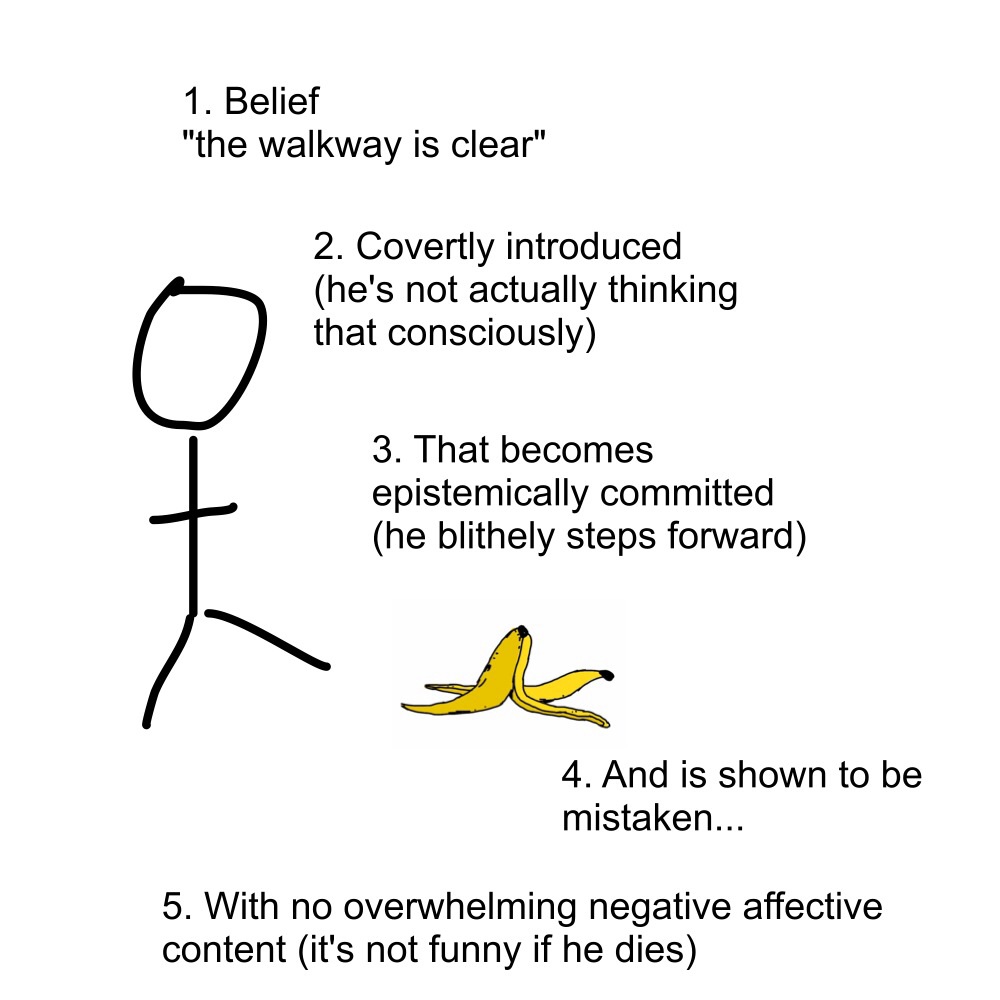 Humor and jokes exploit this built-in reward system. The essence of a joke, in Hurley, Dennett, and Adams' view, is that the teller of the joke surreptitiously introduces a certain epistemic commitment, and then reveals it to have been mistaken. When we experience humor, we are led down a "garden path" of a mistaken assumption, introduced covertly, and then the mistaken assumption is revealed. A joke relies on a: 1. covertly introduced 2. epistemic commitment or assumption 3. that is revealed to be false. (See my previous essay Puzzle Theory for a more detailed explanation of the theory.)