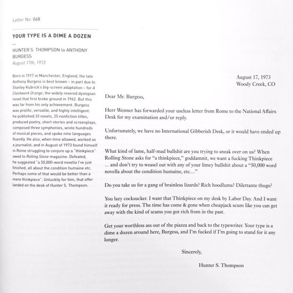 What was at stake in the conflict was more than a commissioned piece of writing in exchange for a payment. For Thompson -- though clearly not to Burgess -- the conflict was between the bold and vigorous American literary tradition he represented, and the tired, effete and cowardly European literary tradition that he called Burgess out for retreating to.