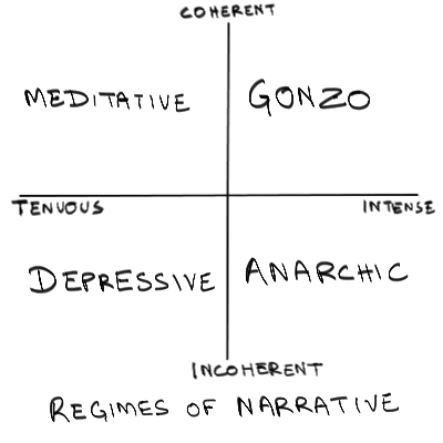 In the purest, most bright-edged cases, the emotional texture of a stream has the sort of extreme clarity and intensity that we associate with the idea of gonzo behavior, even if it lacks any semblance of logical or moral clarity. Unlike persuasive rhetoric, narrative only requires clarity in pathos to keep moving. Clarity in ethos and logos are optional extras./* The infinite justice of Hunter S. Thompson*/