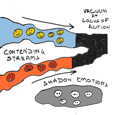 As a result, the vacuum at the locus of action gets filled with emotionally coherent stream of kinetic energy. I'll just call this a stream from here on out. The sense in which I've used the term in other posts harmonizes well with the sense here. So you can have a stream that is calm, a stream that is angry, a stream that is gurgling along joyfully, a stream that is cascading adventurously through rapids, and so on. The opposite of a stream in this emotional sense is any sort of stagnant, fetid pool of dark, unprocessed shadow emotion, which is resisting resolution into action.
