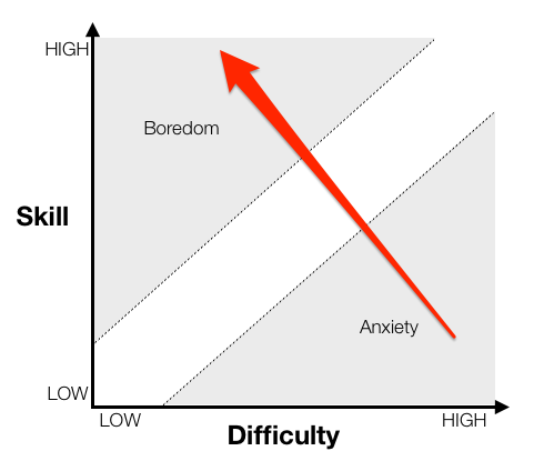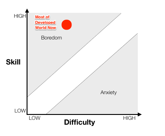 As we move towards the end the Industrial era, we’ve overshot. There is a space of dynamic equilibrium at the boundary between boredom and anxiety. This space is often called flow, the feeling of being fully absorbed. It’s the “in the zone” sensation professional athletes talk about, where they are able to black out everything but the task at hand.