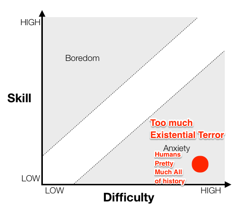 The typical modern human’s day-to-day environment has achieved such a low level of uncertainty that existential terror has been replaced by the existential vacuum: Boredom.
