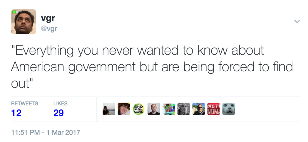 But as I listen to the bull case for the Trump administration, my bullshit meter is ringing non-stop. This tweet from my favorite new twitter account captures the typical output from my bullshit meter when I listen to yet another sunny narrative grounded primarily in stock market signals.