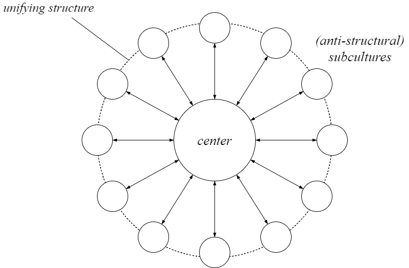 The idea of 'In this way, subcultures are (at least relative to counterculture) more predisposed to connection than opposition, but they will not behave automatically so. A center, somewhat like the town square of old, is necessary (see Fig. 2) which can facilitate connection' is a very key idea, one that I came to via Hannah Arendt's discussion of the public combined with observations of the decay of Twitter in its valiant attempts to serve that particular role.