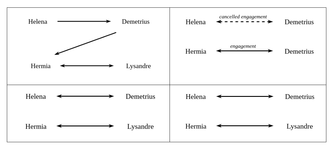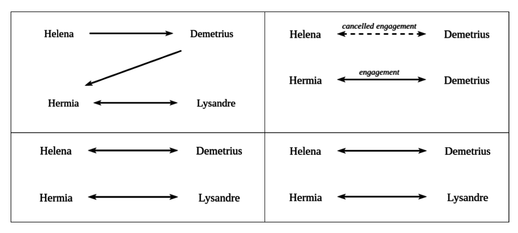 Shakespeare's A Midsummer Night's Dream charts the course of four couples' mutating relations over the course of four days (the length of festivities leading up to one of the couples' - Theseus and Hippolyta - planned marriage day). At the play's start, conflict emerges in a set of unbalanced, asymmetrical relationships that endangers social stability: Hermia's father, exerting his traditional power as arbiter of his daughter's marriage choice, threatens her with the legal punishment of exile to a convent should she protest her planned engagement to Demetrius in favor of Lysandre (with whom she is in love). A utopian, pragmatic society which adequately deals with its citizens' conflicting desires has been prevented by tradition; this forms the central conflict of A Midsummer Night's Dream, which juxtaposes an ideal possibility with the traditional dysfunction, "two social planes, of which one is preferred and consequently in some measure idealized."[1] In this case, by presenting romantic marriage between Hermia and Lysandre as the play's resolution, Shakespeare privileges the "pragmatic" progressive model over the conservative malfunctioning worldview.