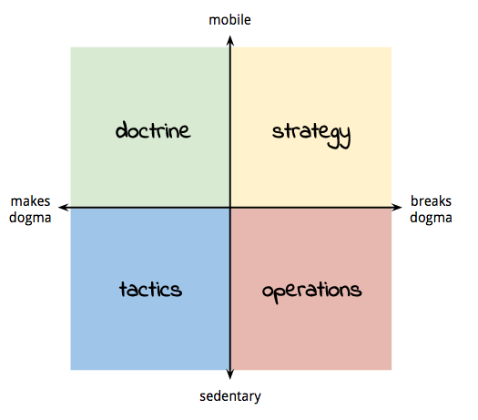 One quadrant is not "higher" than the other. Often you'll find that a new tactic developed under the gun informs a new doctrine, which then generates new strategies.