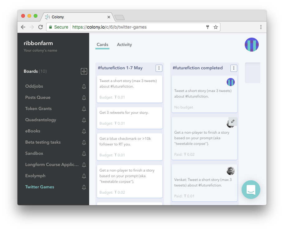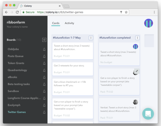 Be careful what you wish for. I'm suddenly finding myself in the middle of a kind of tribe-generating metatribe of bloggers, helping coordinate a sprawling collection of highly weird writing projects through a clever Ether-based poker game slash taskboard called Colony.io.