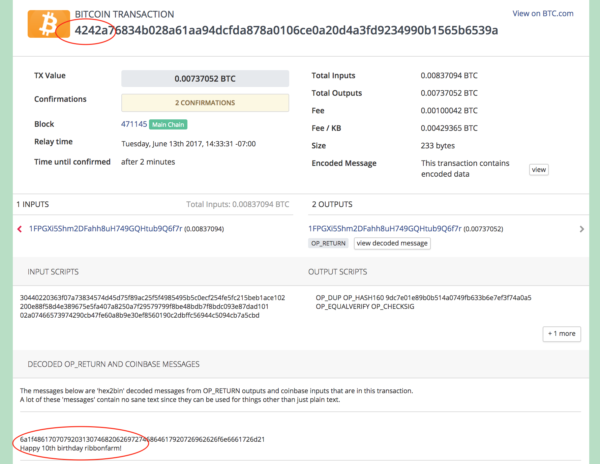To commemorate and memorialize the historic occasion, our resident alpha hacker Artem Litvinovich put a bit of birthday graffiti on the bitcoin blockchain. Notice the pair of leading 42s on the transaction id? That required some special low-level uber-hacking. It's not something standard bitcoin applications can do. In his words, "You need to control the innards of the ECDSA signing code to do something like that." I have no idea what that means, but I'm very pleased to get a special bespoke-magic-engineered birthday card here.