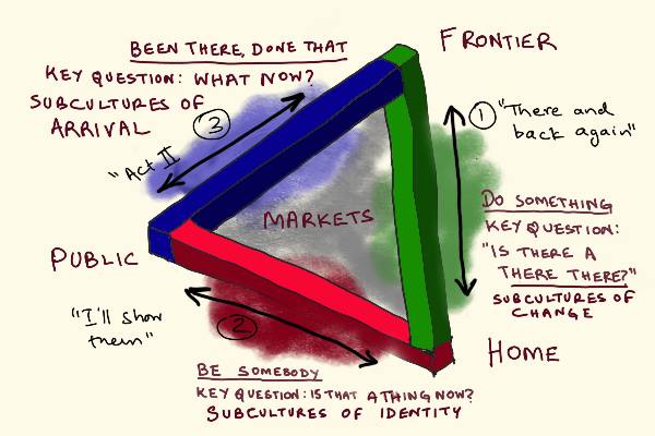 The be somebody path leads, via identity forming subcultures, to the public vertex, and a visible place at the heart of human affairs, whether honorable or dishonorable. The do something path leads to the frontier vertex and a piece of whatever exciting action is unfolding at the margins of human affairs when you are coming of age. The key questions you ask (and possibly answer) along the two paths are is this a thing now? and is there a there there? respectively. Questions about emerging social realities that you might ride to become somebody of consequence, versus questions about material realities that you might explore to do something original.