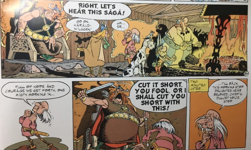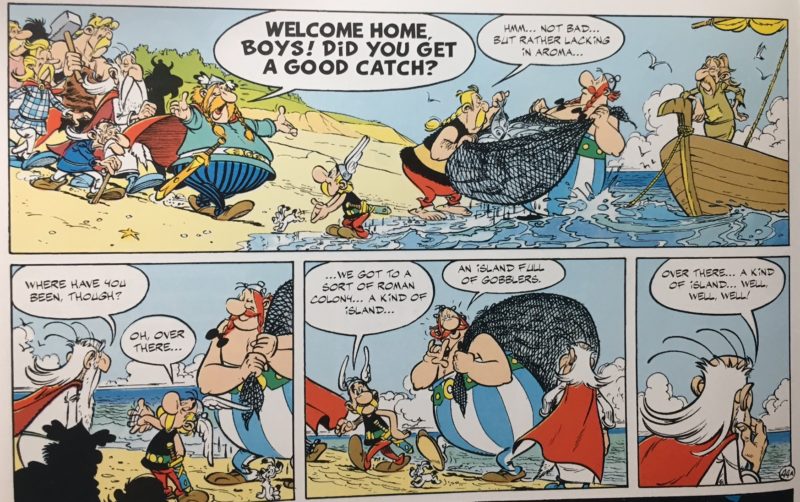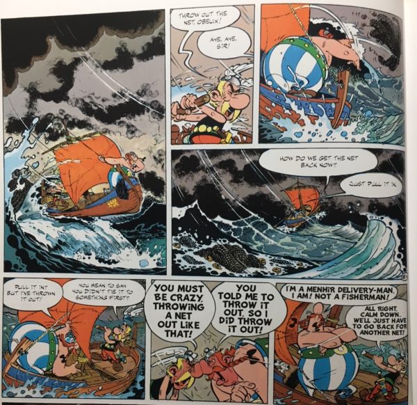 The closest you get to a dragon-like adversary is the weather. The comic-book panels in this post are from Asterix and the Great Crossing, possibly the best boat story ever told. Asterix and Obelix go off to get some fresh fish for the druid, and a great storm carries them across to the Americas. Throughout, they remain convinced they are in some part of Europe. There, some Vikings on a regular hero's journey (who do know they've found a new continent) find them and bring them back, imagining them to be natives (the poor Viking adventurers gain no honors when their tribe realizes that the natives are just Gauls, from their own backyard, and refuses to believe the story of the Great Voyage).
