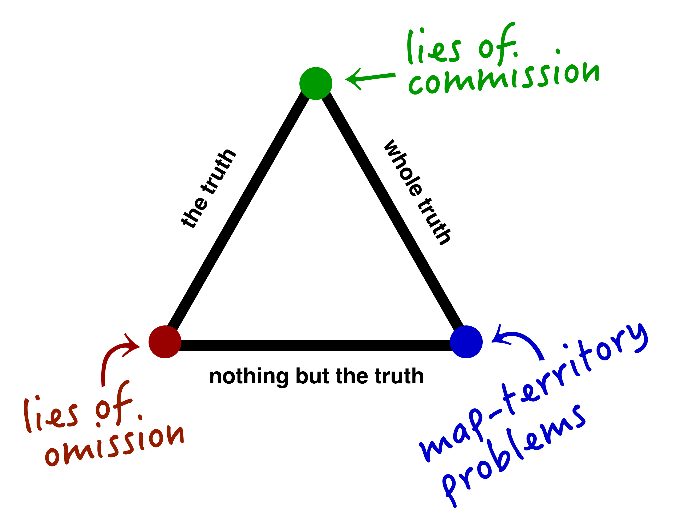 For anything really complicated you only get to optimize for two sides of the truth trilemma. The corners of the trilemma represent three kinds of epistemic blindspot:- Truth + nothing-but leads to problems with recall, or lies of omission. (ducks)