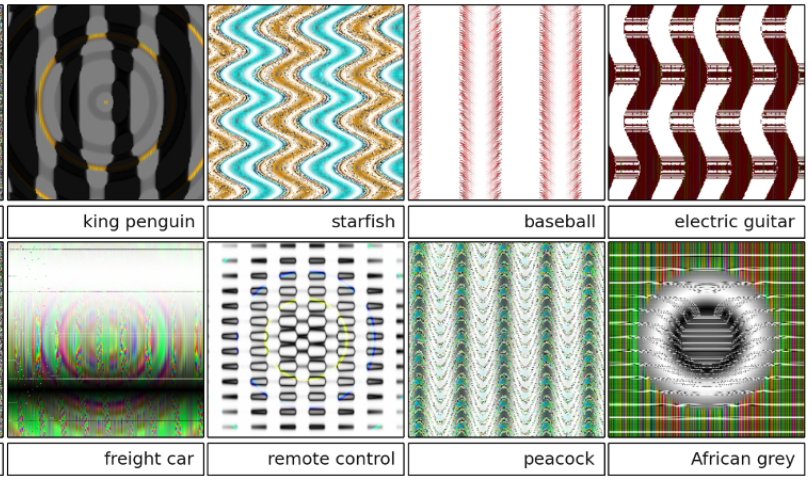explains that these are algorithmic attacks on the classifier, and that the classifier is classifying these as king penguin, etc, with high confidence.