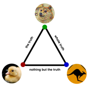 A system designed for truth + whole-truth opens the door to lies of commission, because they must be prepared to answer any question over a very large domain. But by allowing all possibilities (in order to capture the whole truth), they weaken their ability to filter out falsehood. For example, it's fairly easy to fool an AI image classifier by probing its responses to random images, or altering "good" images in subtle ways to mislead them. You can get one to swear blind that a funny pink squiggle is in fact a poodle, or that a tabby cat is a bowl of guac.These dog (aka precision) problems are harder than duck problems because of the underlying math. There are always vastly more fake images than real ones.